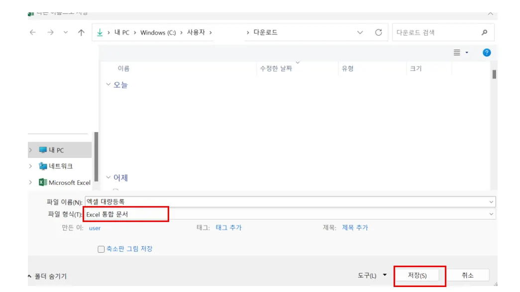 엑셀 시트에 모든 정보 기입 완료 시 [ 다른 이름으로 저장하기 ] 하여 파일 형식은 [ Excel 통합 문서 ] 로 선택하여 저장해요.