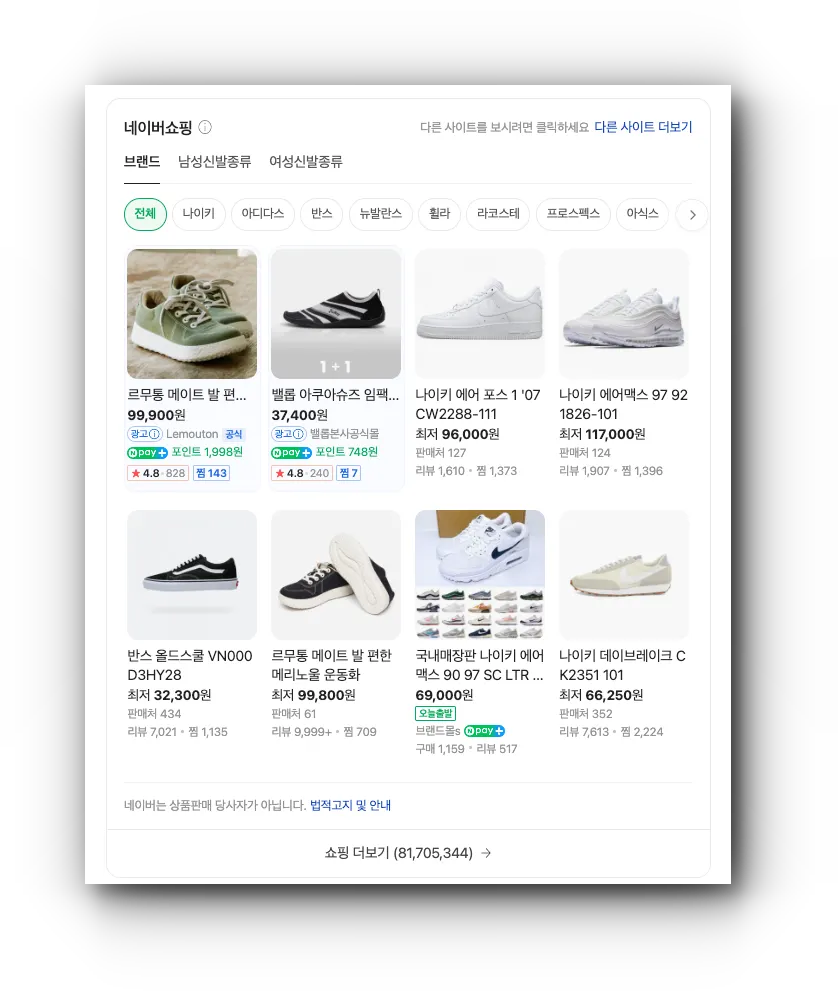 네이버에 “신발”을 검색하니 운동화 등 다양한 신발이 노출돼요.