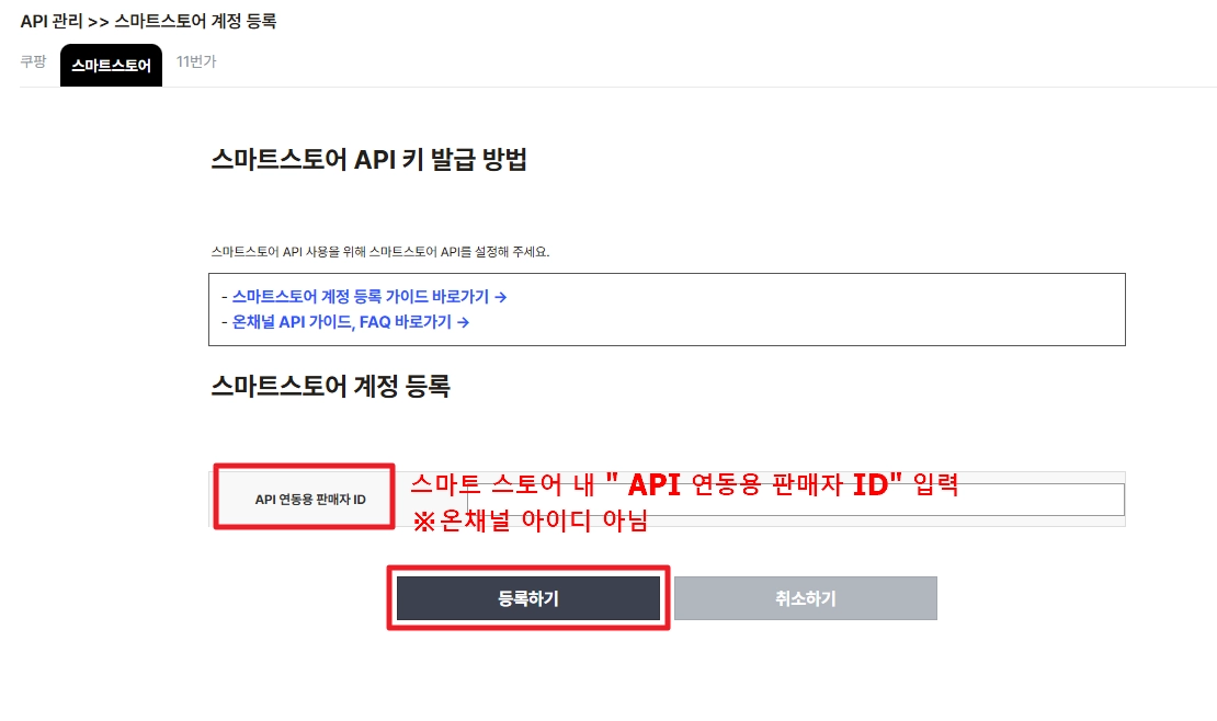 *API 연동용 판매자 ID는 온채널 ID가 아닌 스마트 스토어의 API 연동용 판매자 ID를 입력해 주세요.
