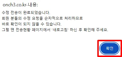 ‘수정 전송하시겠습니까?’ 창과 ‘수정 전송이 완료되었습니다.’ 창이 뜨면 [확인] 버튼을 누른 뒤 온채널 내에서 전송 결과를 확인하고 쿠팡에 정상 반영되었는지 확인해 주세요.