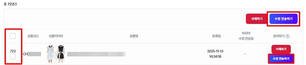*여러 개 상품을 수정 전송하려면 왼쪽 체크박스를 선택하고 목록 맨 위에 [수정 전송하기] 버튼을 눌러 주세요.