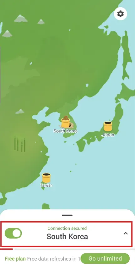 South Korea 를 확인하고 왼쪽에 회색 버튼을 눌러 초록색으로 활성화해 주세요.
