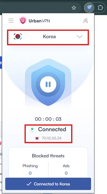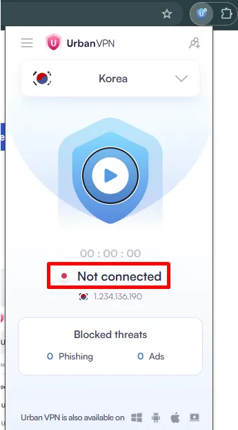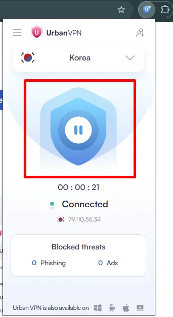 브라우저 상단에서 Urban VPN 아이콘을 다시 눌러주세요.