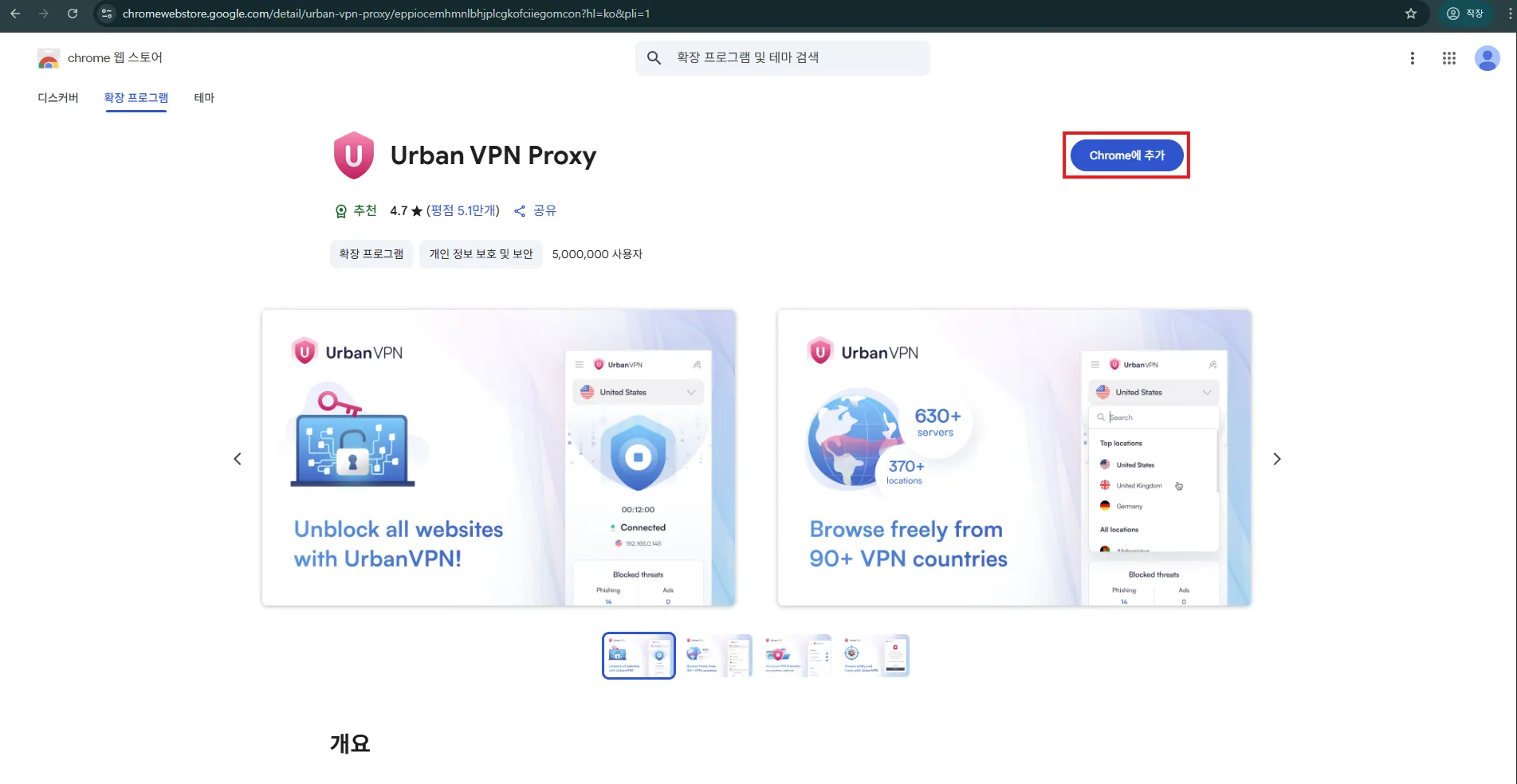 아래 링크를 클릭해 Urban VPN 확장 프로그램 설치 페이지로 이동합니다.