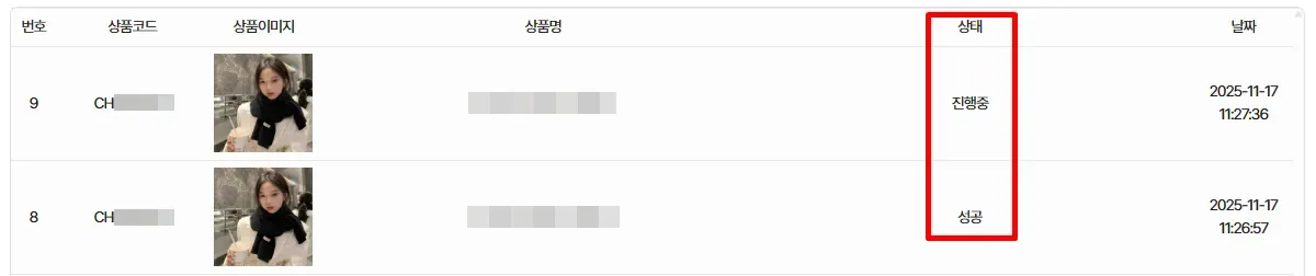 전송한 상품의 상태를 확인해요. 다른 상품을 등록 또는 수정 전송을 진행하고 있다면 진행 중인 건이 완료된 후에 추가로 등록 또는 수정 전송이 가능해요.