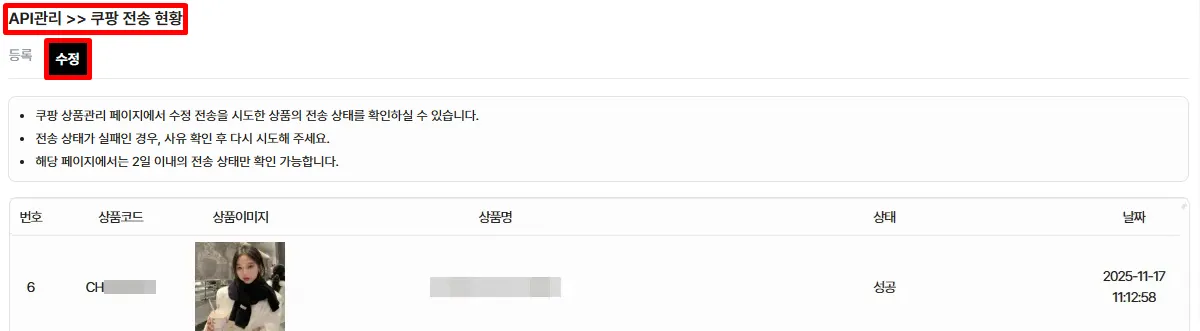 온채널 마이페이지 내 [API 관리 > 쿠팡 전송현황] 메뉴에서 위쪽의 탭 중에 [수정] 탭으로 들어가요.