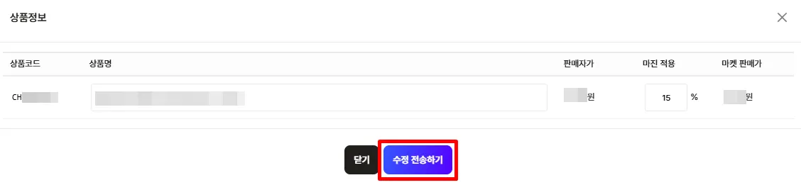 상품 정보 창이 뜨면 보내려는 상품을 확인하고 [수정 전송하기] 버튼을 눌러요.