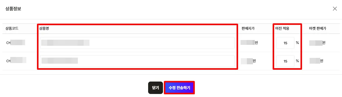 상품 정보 창이 뜨면 보내려는 상품을 확인하고 [수정 전송하기] 버튼을 눌러요.