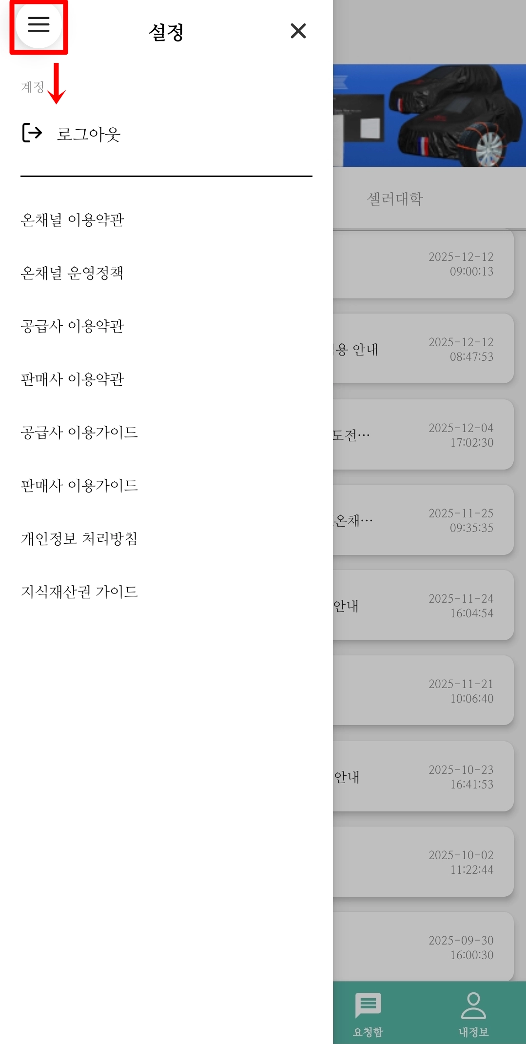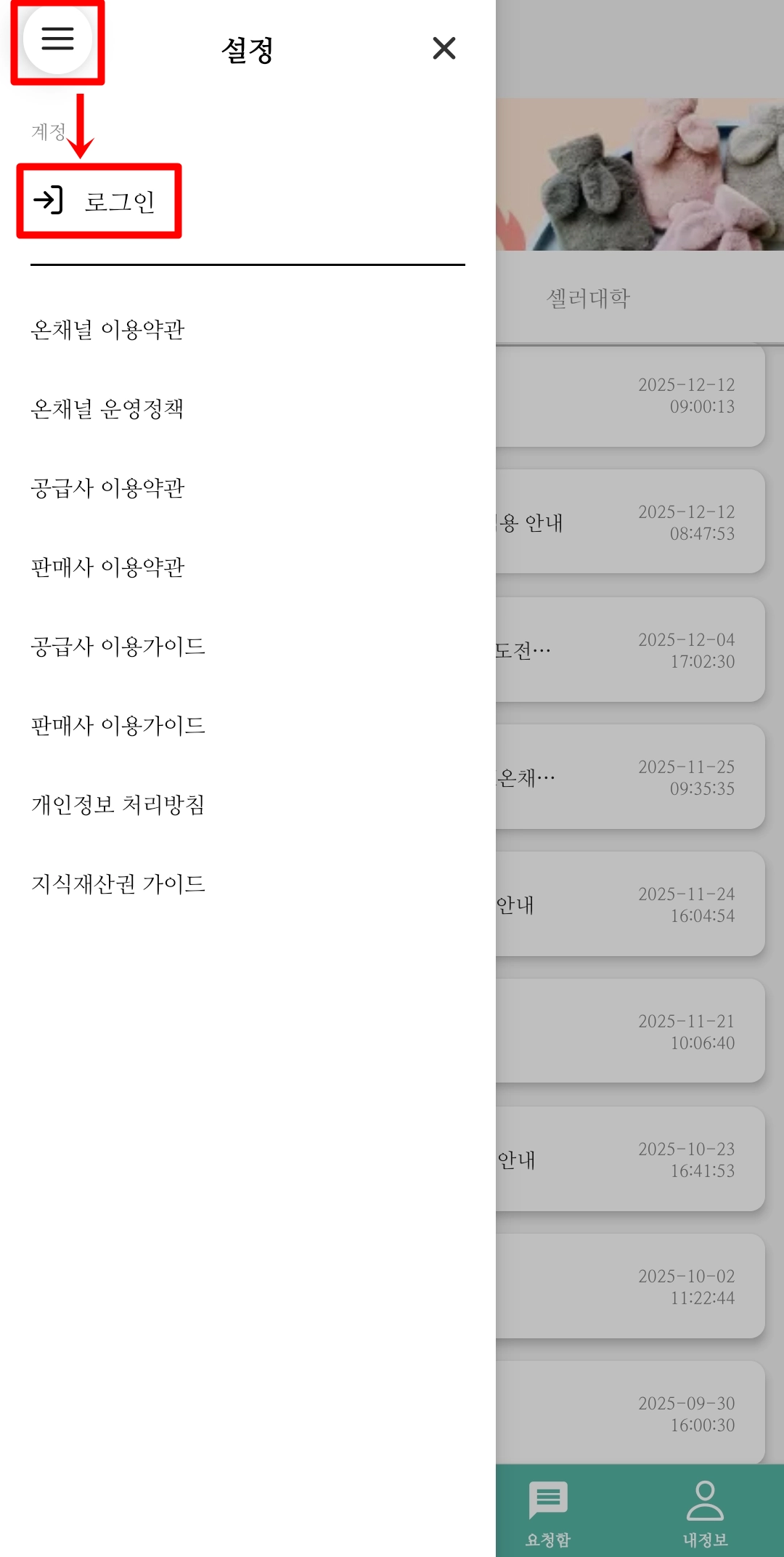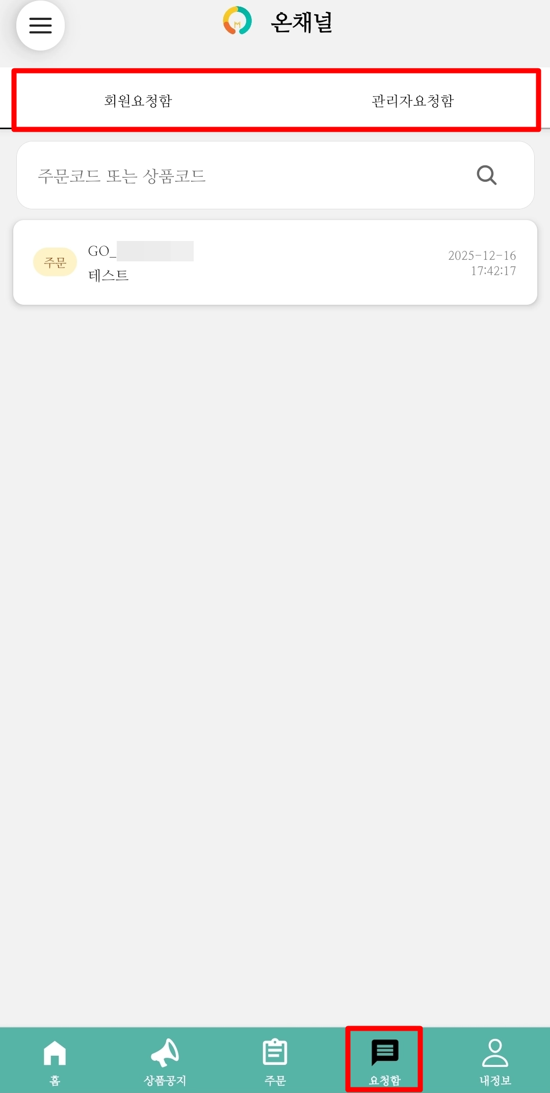 온채널 마이페이지 → 왼쪽 상단 [요청함]