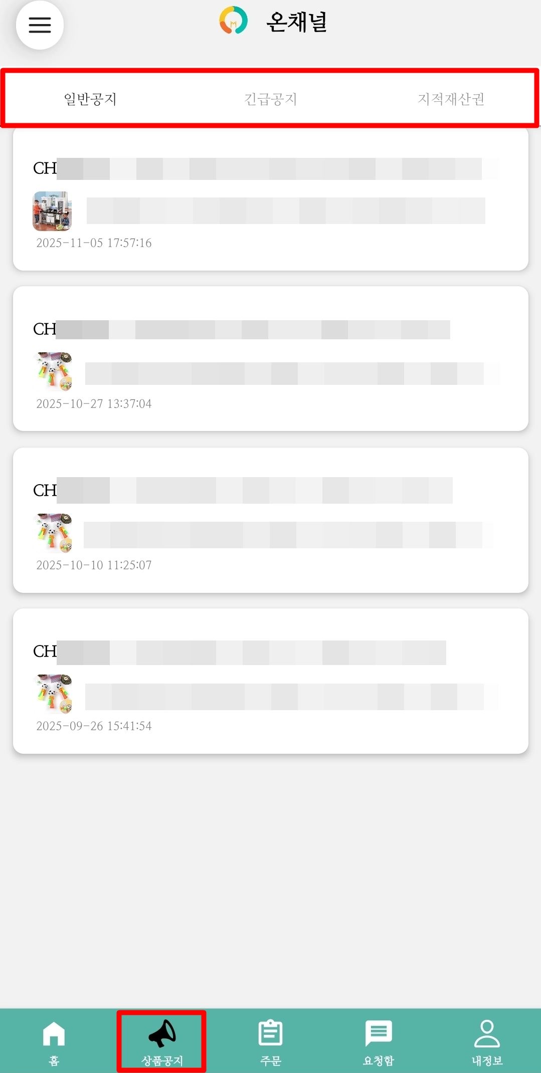 온채널 마이페이지 → 공지사항 → 전체상품 공지사항 → ‘상품공지’ 탭