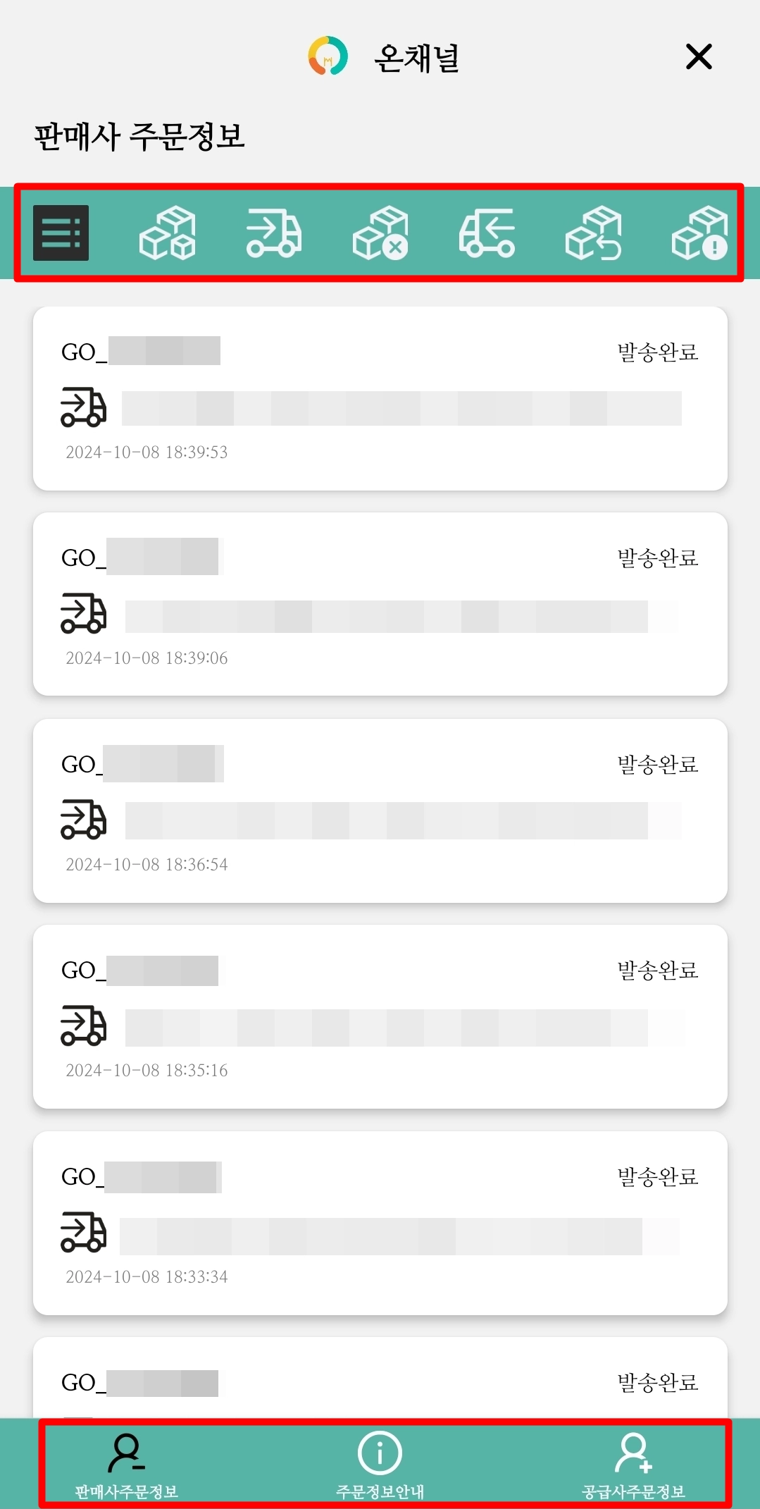 공급사인 경우, 온채널 마이페이지 → 공급사 정보 → 주문 정보