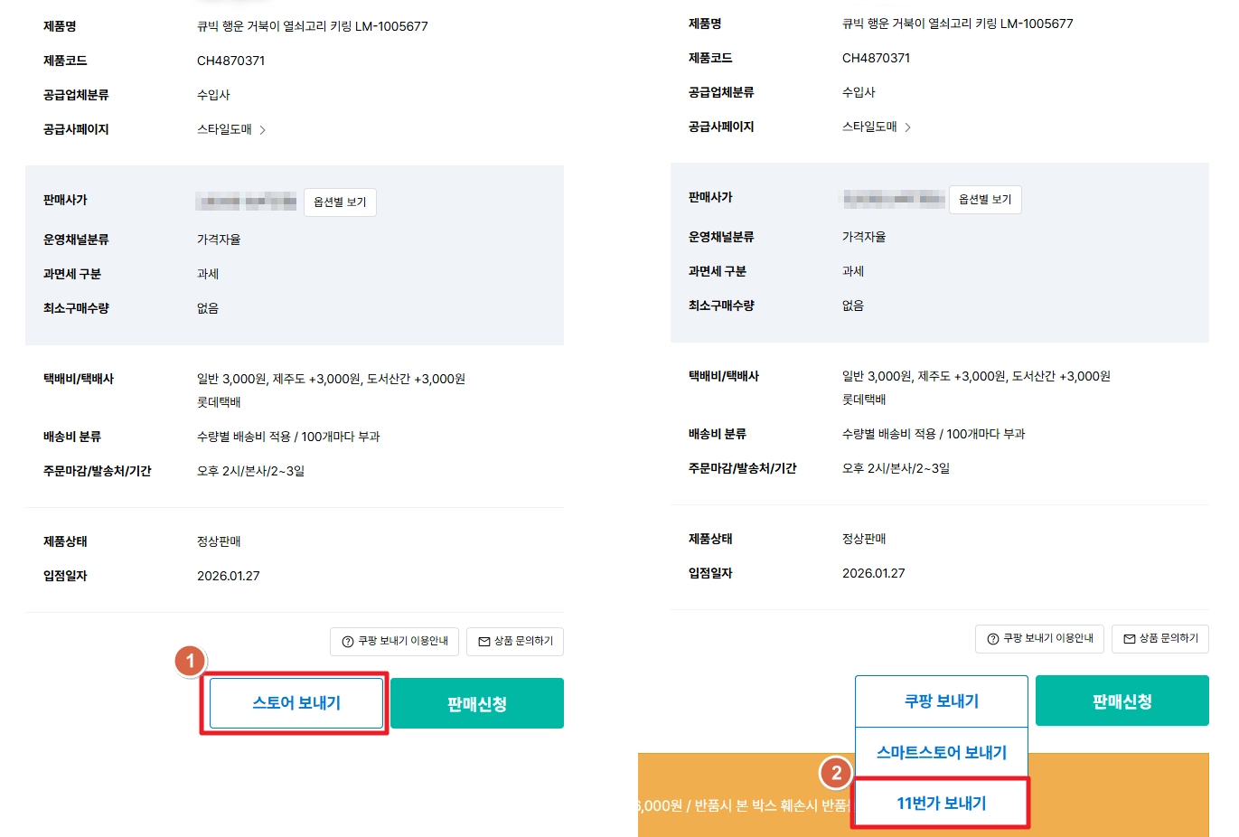 (2) 상품 페이지 내 [스토어 보내기 > 11번가 보내기] 버튼을 순서대로 눌러요.