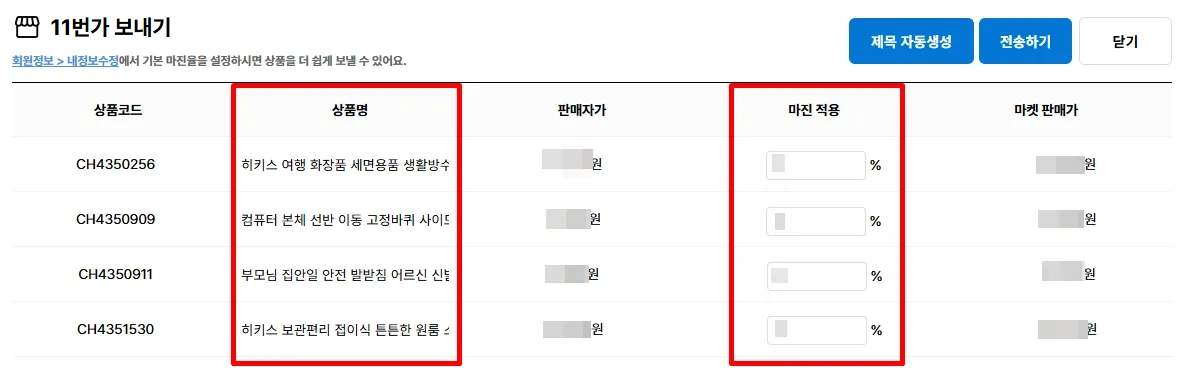 [내정보수정] 메뉴에서 아래로 내려 ‘상품 보내기 기본 마진’ 설정을 찾아, 원하는 기본 마진 %를 적어주세요.