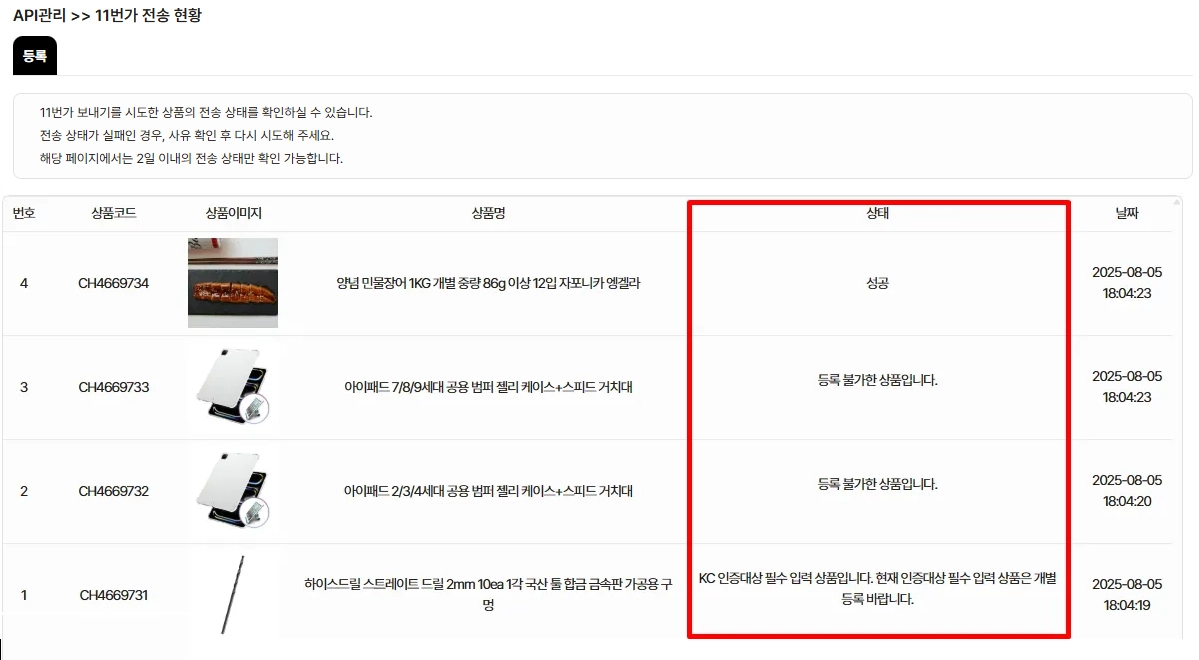 *최대 2일 전 상품까지 확인 가능하며, 상태 값이 전송 실패일 경우 11번가에 등록되지 않으므로 상태 확인 후 재등록해야 해요.