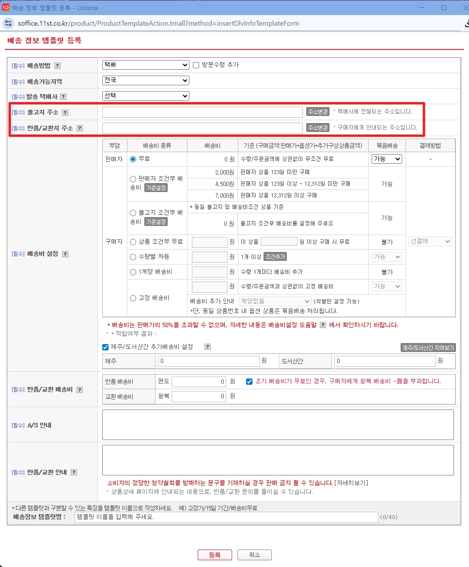 실제 등록 시: 출고지, 반품/교환지를 제외한 나머지 정보(택배사, 배송비 등)는 11번가 템플릿 설정값이 아닌, 온채널 상품의 실제 정보로 자동 교체되어 등록됩니다.