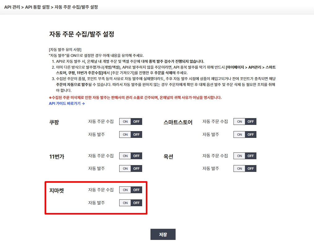 *자동 발주는 자동 주문 수집된 건이 자동 발주 진행되는 것이기 때문에 자동 주문 수집 기능을 OFF 하면 자동 발주 기능도 같이 OFF 처리 돼요.
