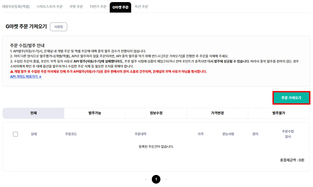 개별 주문 또는 엑셀 주문 처리를 원한다면 중복 주문를 막기 위해 [주문 가져오기] 진행 후 주문 수집 내역에서 삭제한 뒤 주문해 주세요. → 주문 진행 가이드
