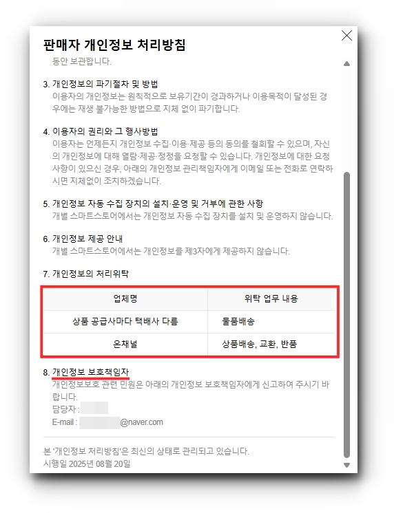 [판매자 개인정보처리방침] 팝업의 7번과 8번 항목에서, 내가 기재한 내용이 노출되고 있는지 확인할 수 있어요.
