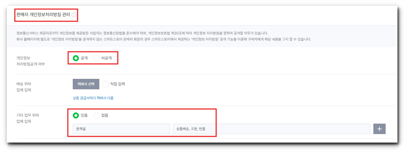 [판매자 개인정보처리방침] 영역에서 개인정보 처리 공개 여부와 업무 위탁 업체 정보를 입력해요.