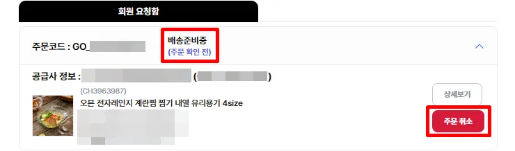주문 취소 / 취소 승인 기능이기 때문에 ‘배송준비중’ 상태인 건에서만 확인할 수 있어요.