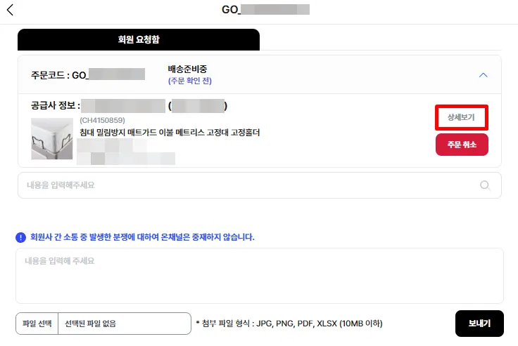 요청 창 위쪽에 주문 코드를 누르면 [상세보기] 버튼이 나와요.