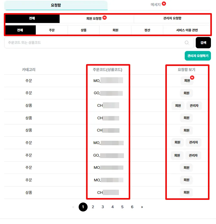 위쪽 ‘전체’, 회원 요청함, 관리자 요청함 필터에서 모두 확인 가능 |