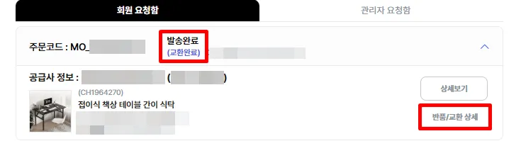 발송완료(교환완료): [반품/교환 상세] 버튼을 확인할 수 있으며, 버튼을 눌러 이전 교환 내역을 확인할 수 있어요.