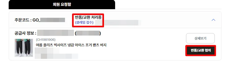 반품/교환 처리중(클레임 접수, 비용 협의 중): [반품/교환 협의] 버튼을 확인할 수 있으며, 버튼을 눌러 현재 진행 중인 반품/교환 내용을 확인하여 답변 및 협의 진행 처리를 할 수 있어요.