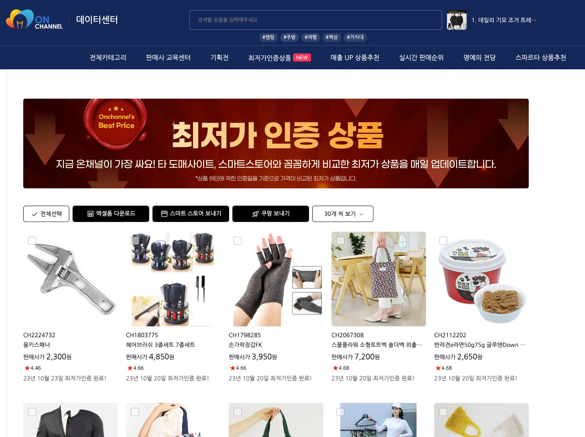 ‘최저가인증상품’ 메뉴에 노출되는 상품들은 온채널에서 직접 검증한 최저가 상품들입니다. 매일 새롭게 업데이트되는 최저가 상품을 확인하여 더 원활한 판매 활동을 하시기 바랍니다.
