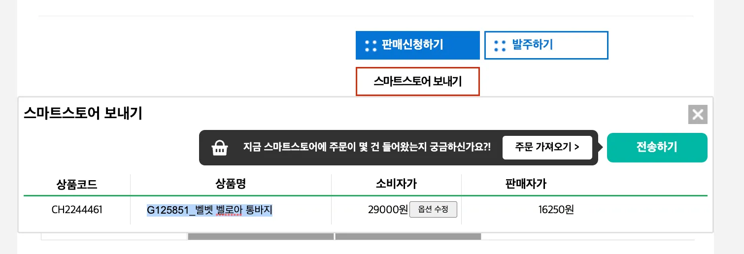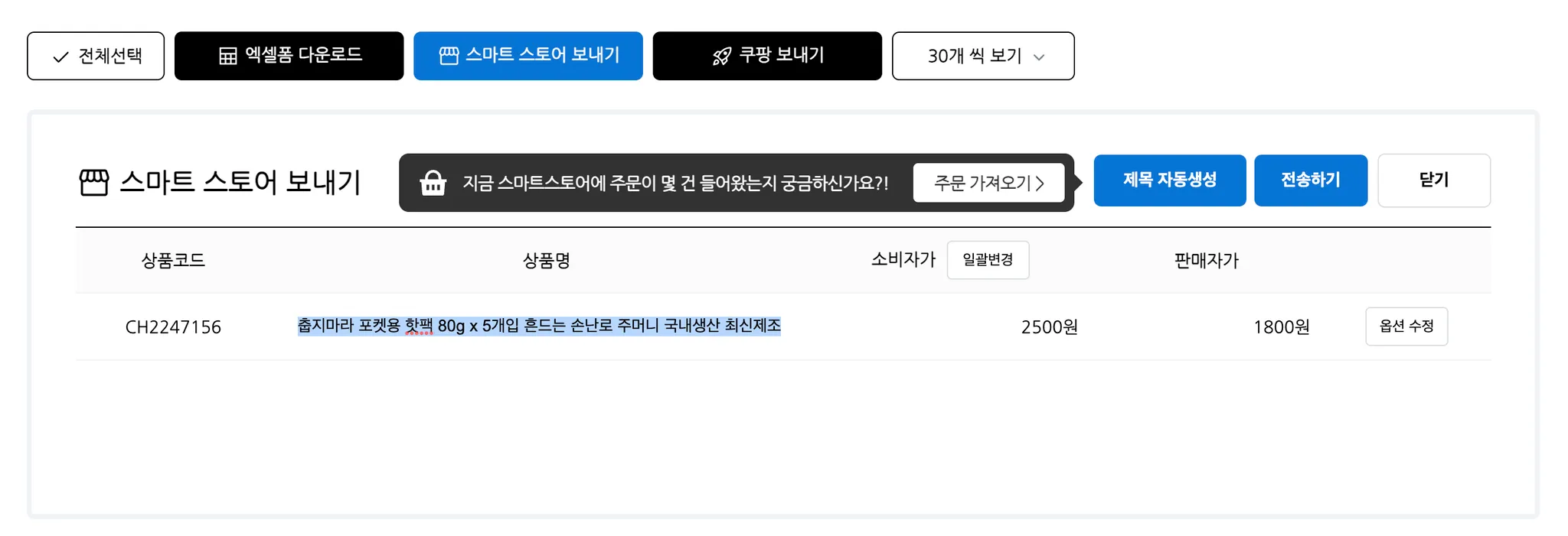 데이터센터 > 상품 상세페이지 > [스토어 보내기] > [스마트스토어 보내기] 혹은 [쿠팡 보내기] 시 ‘상품명’ 영역 수정
