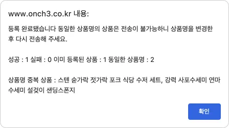 상품명 중복 건 전송시 메세지 노출 예시: 아래의 이미지 참고