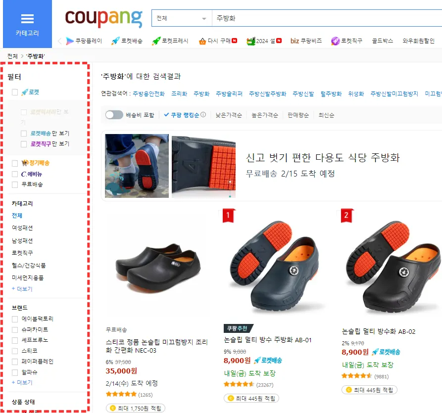 쿠팡 검색 기능은 카테고리 상품명 검색어 검색필터 네 가지 정보에 속한 단어를 조합해 검색 결과를 보여줘요.(검색 키워드로 쓰여요)