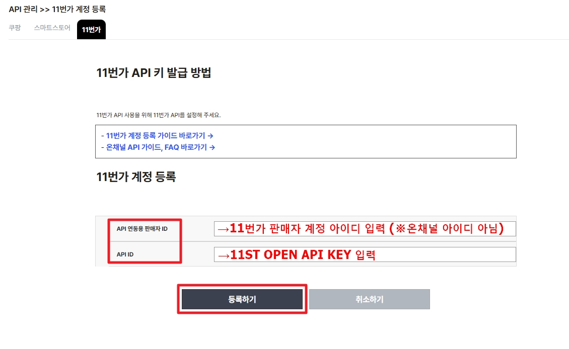 ‘API 연동용 판매자 ID’ 는 11번가 판매자 계정 아이디를 적고, ‘API ID’ 는 여기서 확인했던 발급받은 11ST OPEN API KEY 를 기재한 후 [등록하기] 버튼을 눌러요.