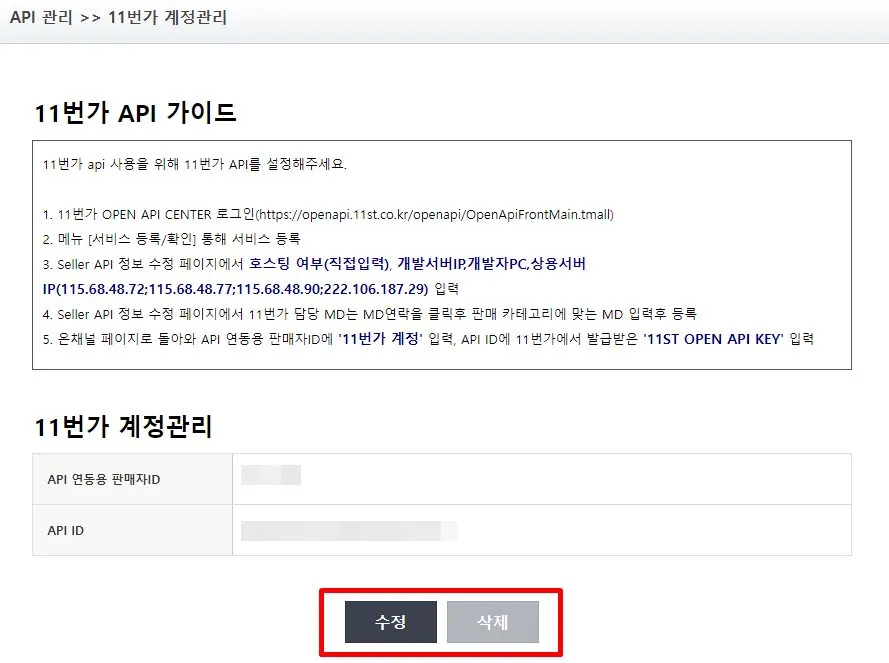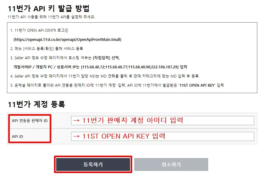 ‘API 연동용 판매자 ID’ 는 11번가 판매자 계정 아이디를 적고, ‘API ID’ 는 발급받았던 11ST OPEN API KEY 를 기재한 후 [등록하기] 버튼을 눌러요.