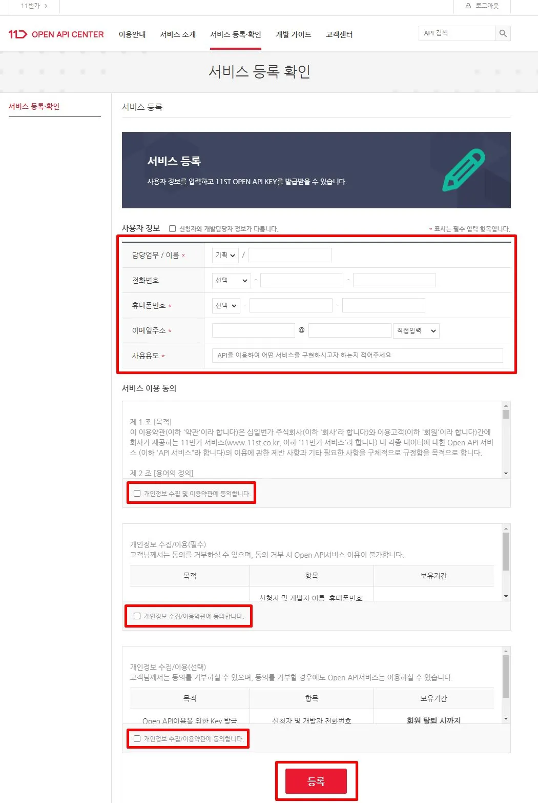사용자 정보를 모두 입력하고 서비스 이용 동의 모두 선택하신 뒤 [등록] 버튼을 눌러요.