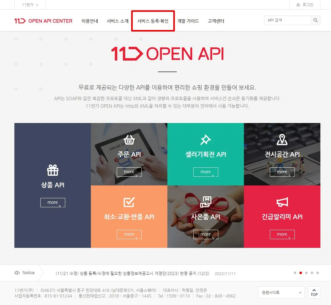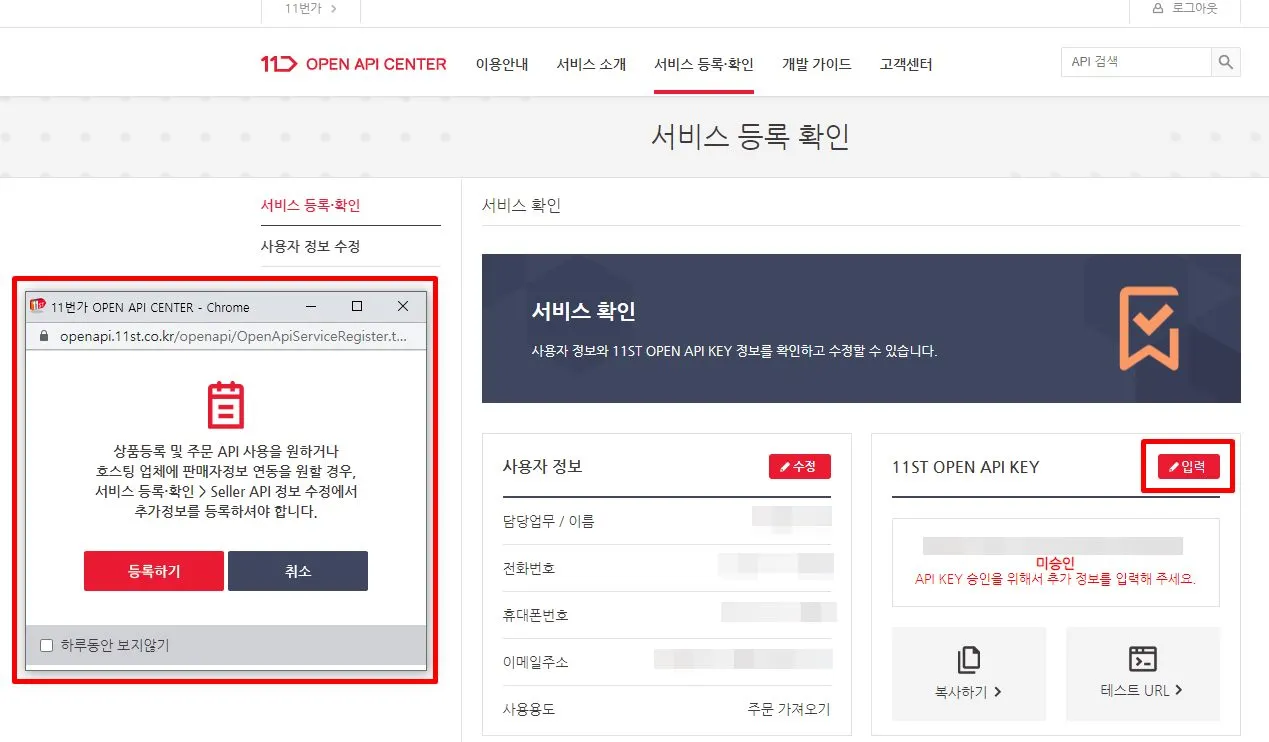 입력을 위해 등록 후 뜨는 팝업창 내 [등록하기]나 [서비스 등록·확인 > 11ST OPEN API KEY [등록]]버튼을 클릭해요.