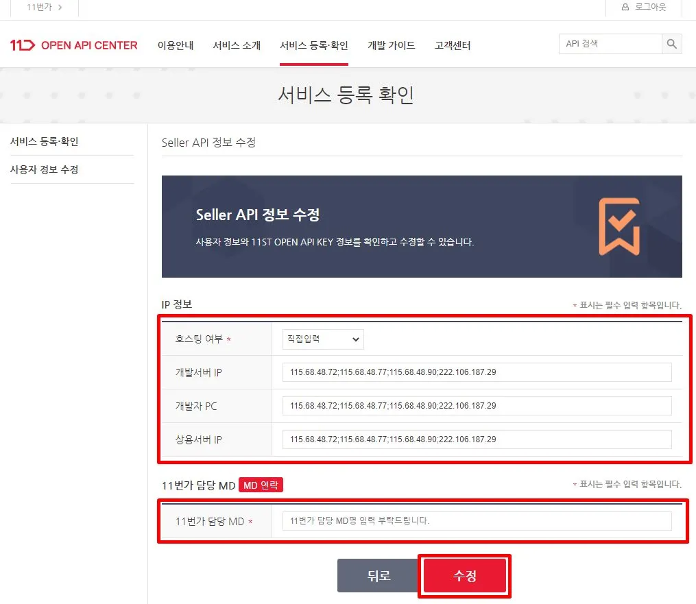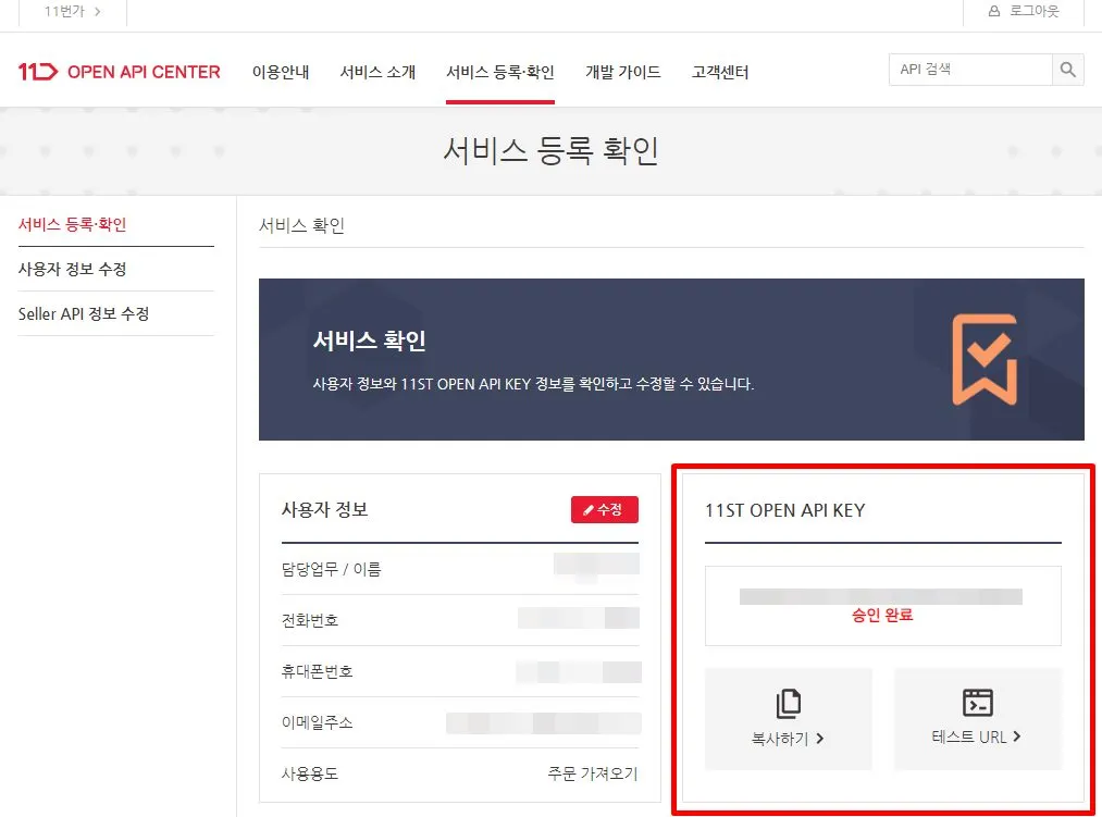 수정을 완료하면 11ST OPEN API KEY 가 [승인 완료]로 바뀌어 있는 것을 확인할 수 있어요.