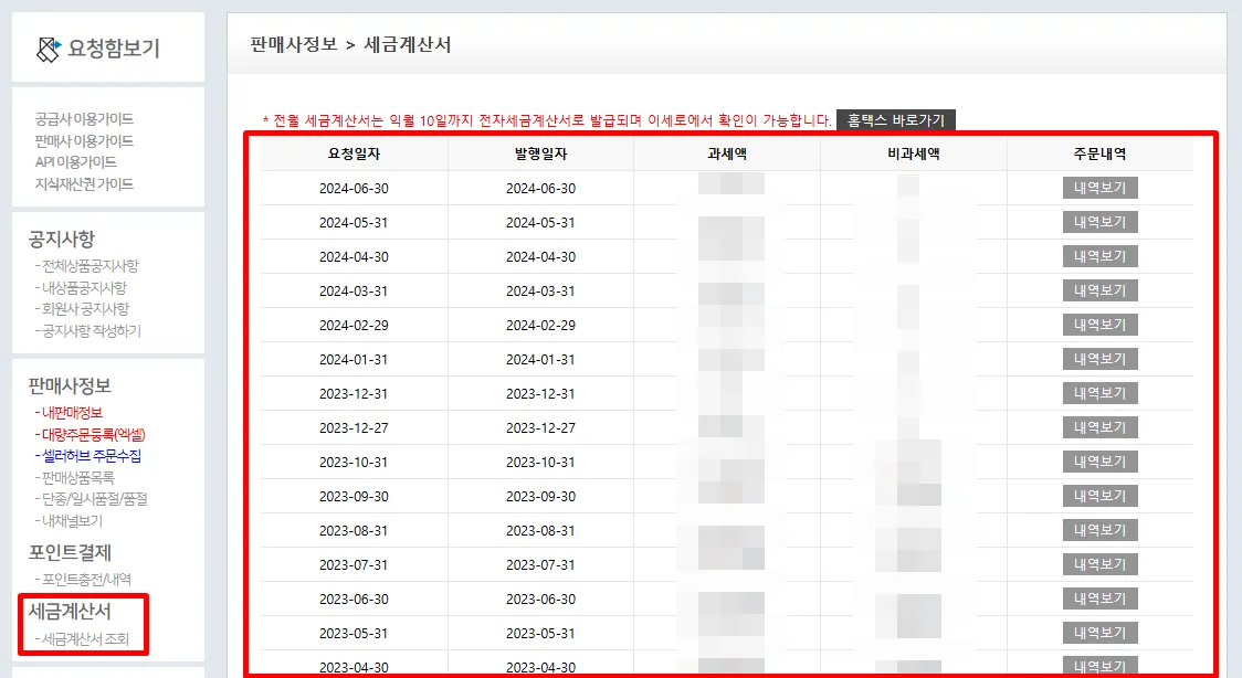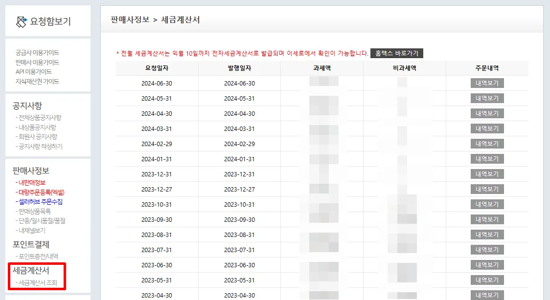 판매사의 경우, 온채널 측에서 주문 내역에 대해서 다음 달 10일까지 세금계산서를 발급하고 있으며 발급된 세금계산서는 홈택스에서 확인할 수 있어요.