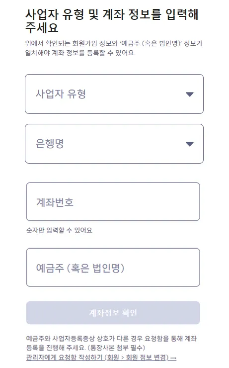 계좌정보 등록 창에서 사업자 유형 및 계좌정보를 입력하고 [계좌정보 확인] 버튼을 눌러요.