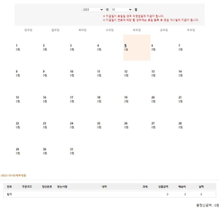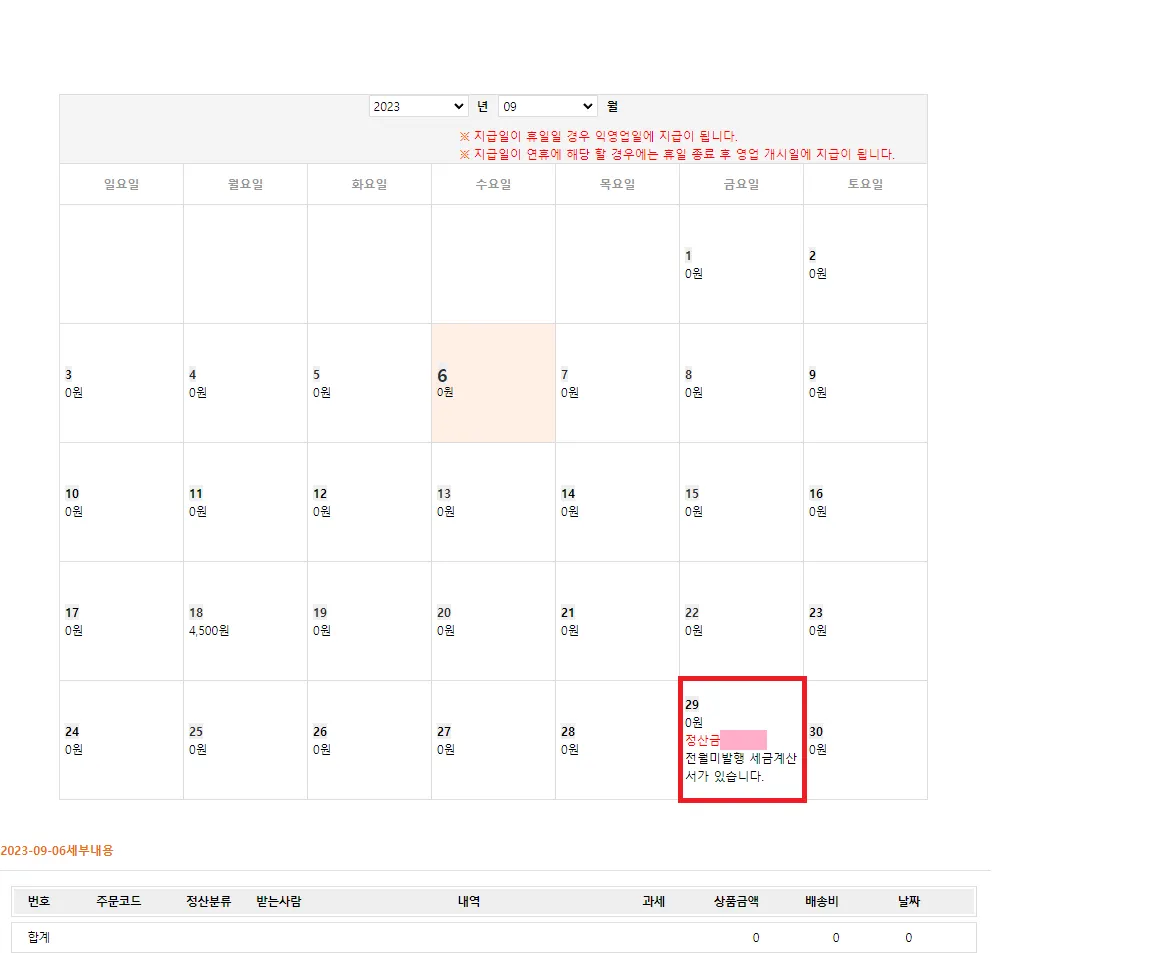 각 날짜에 적힌 금액은 해당 날짜에 송장을 입력하여 정산 받을 금액이 기재된 것으로 날짜를 클릭하면 달력 아래에서 세부 내용을 확인할 수 있어요.