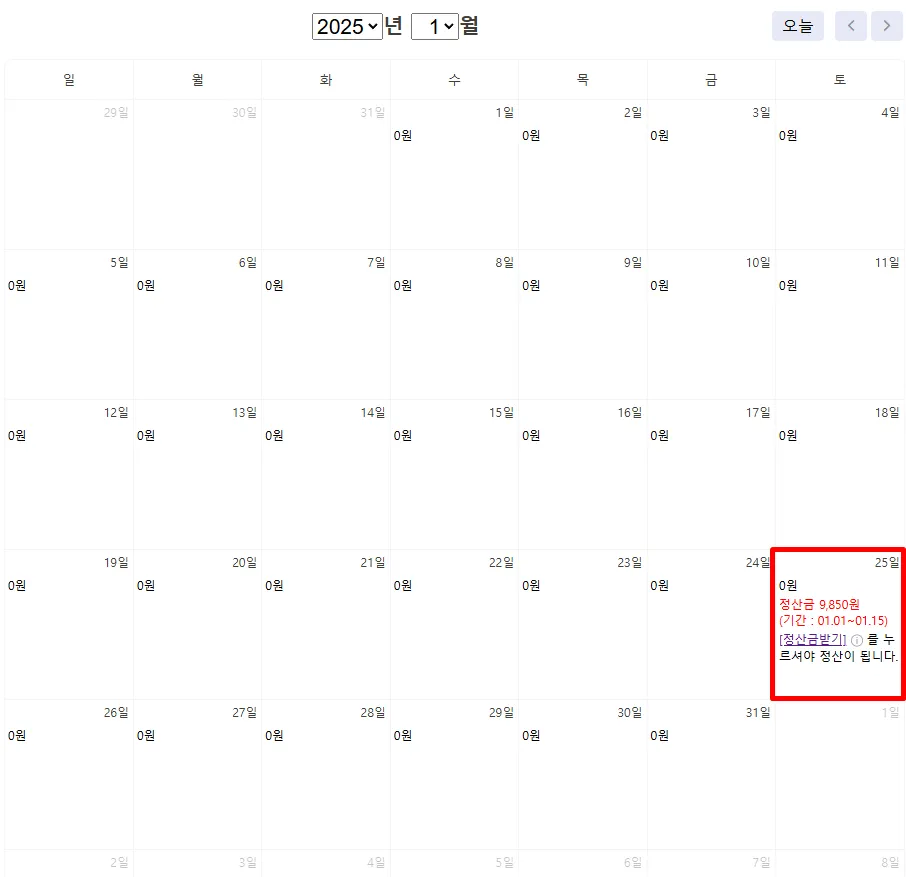 ex. 2025년 1월 1일~15일 기간의 [정산금 받기] 진행했다면, 2월 1일(토) 주말이므로 2월 3일(월)에 정산금 지급
