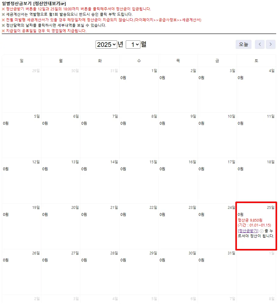*매월 1일~15일 정산금은 당월 16일~25일 오후 6시까지 [정산금 받기] 버튼을 누르면 익월 1일 정산금이 지급되고,