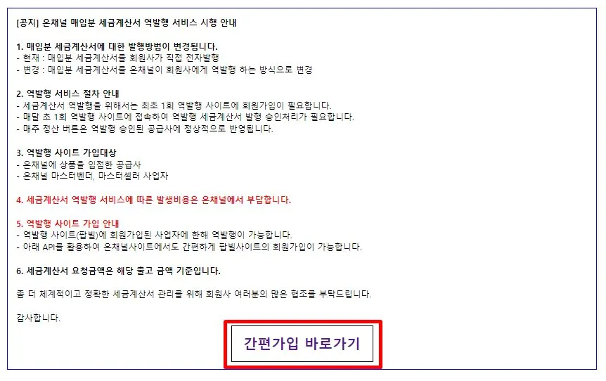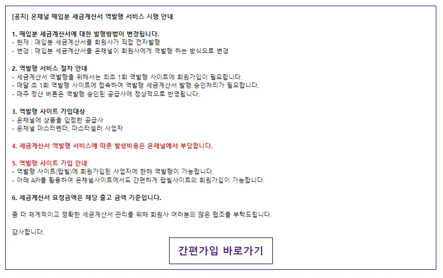 [마이페이지 > 정산내역/요청 - 정산내역 보기] 메뉴를 순서대로 접속하여 [[공지] 온채널 매입분 세금계산서 역발행 서비스 시행 안내]를 확인해요.