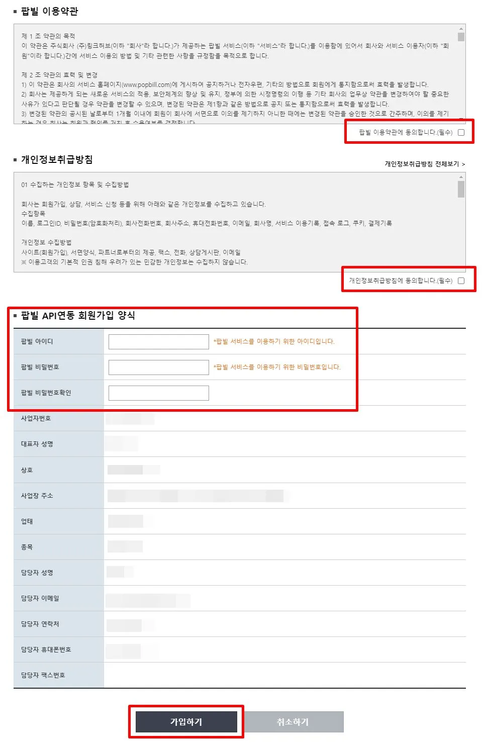 팝빌 이용약관, 개인정보취급방침에 동의 및 팝빌 아이디, 비밀번호를 입력한 후 하단의 [가입하기]를 눌러주시면 정상적으로 가입이 완료돼요.