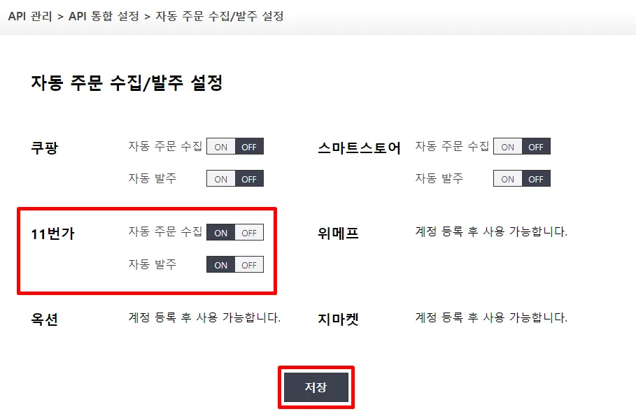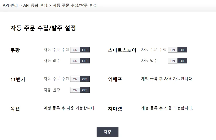 *자동 발주는 자동 주문 수집된 건이 자동 발주 진행되는 것이기 때문에 자동 주문 수집 기능을 OFF 하면 자동 발주 기능도 같이 OFF 처리 돼요.