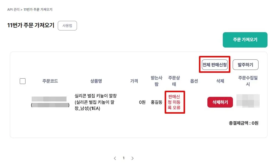 주문 건에 해당하는 오류가 [판매 신청 미 등록 오류] 뿐이라면 [전체 판매시작] 진행 후, 즉시 정상 발주 가능해요.