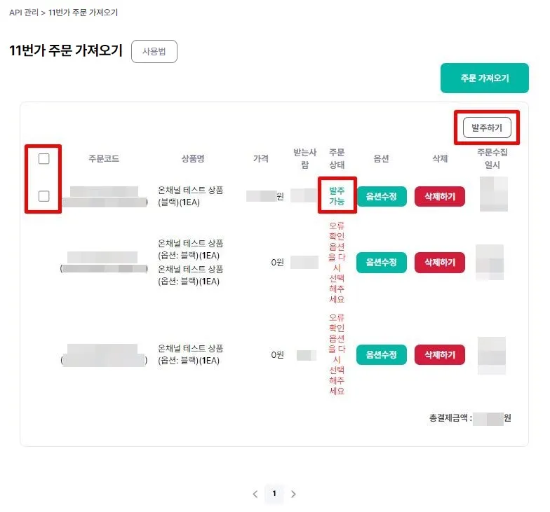 [옵션 수정] 버튼을 누르면 각 주문 건에 선택된 옵션을 확인할 수 있으며, 오류난 건은 빨간색 테두리로 표시되어 있어요.
