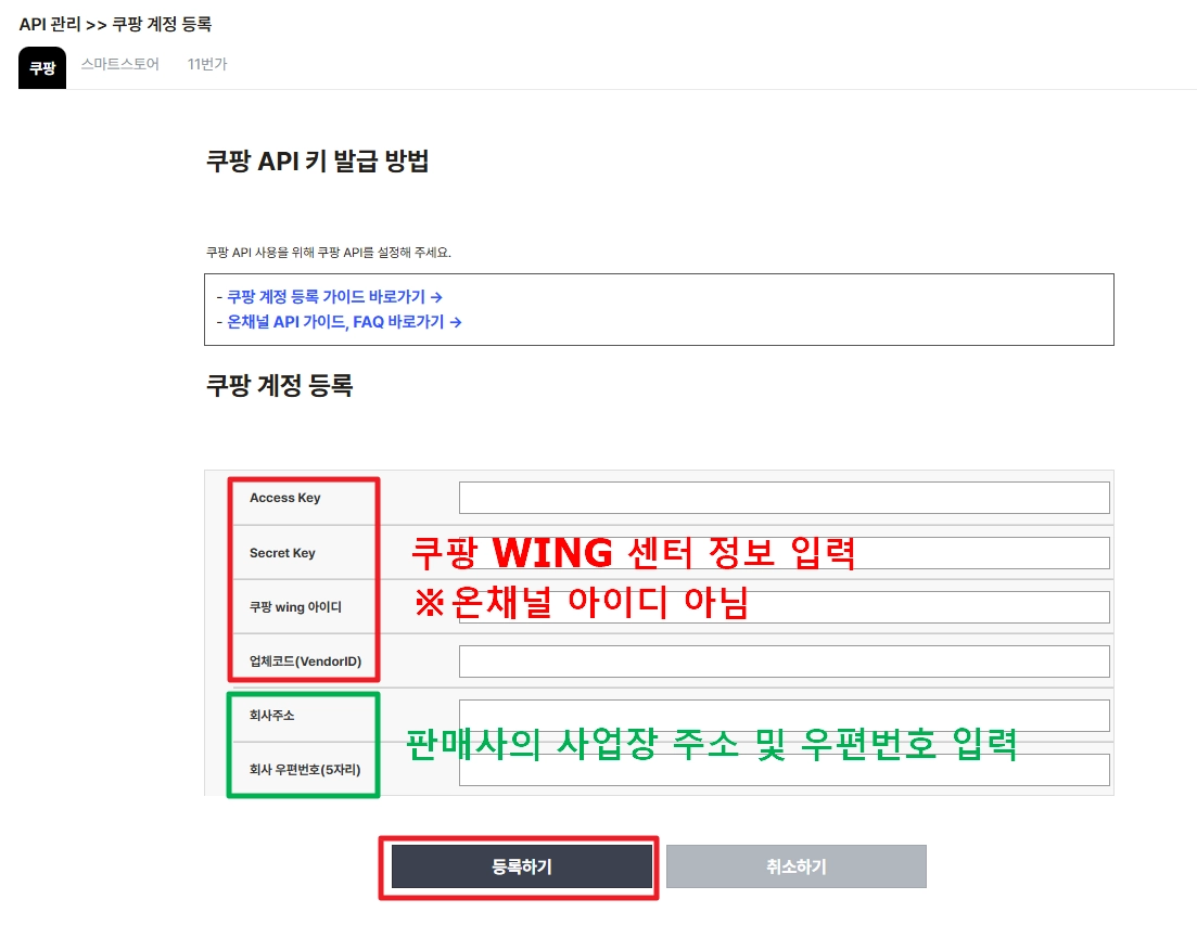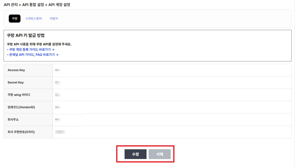 *Access Key’, ‘Secret Key’, ‘업체코드 : 쿠팡 API 계정 발급 시 확인했던 키 입력
