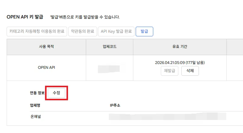 이미 등록된 API 키가 있다면 [수정] 버튼을 누르고 8번으로 이동하여 확인해 주세요.