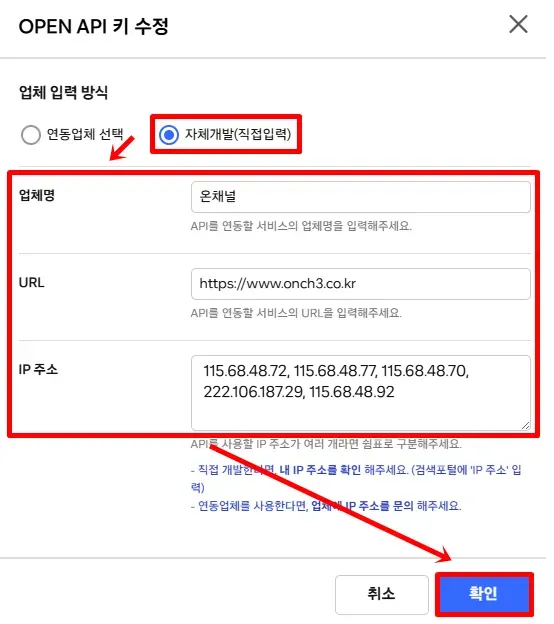 업체명, URL, IP 주소는 아래 내용을 복사해 빈칸 없이 채운 후, [확인] 버튼을 눌러 API 키 발급을 완료해 주세요.